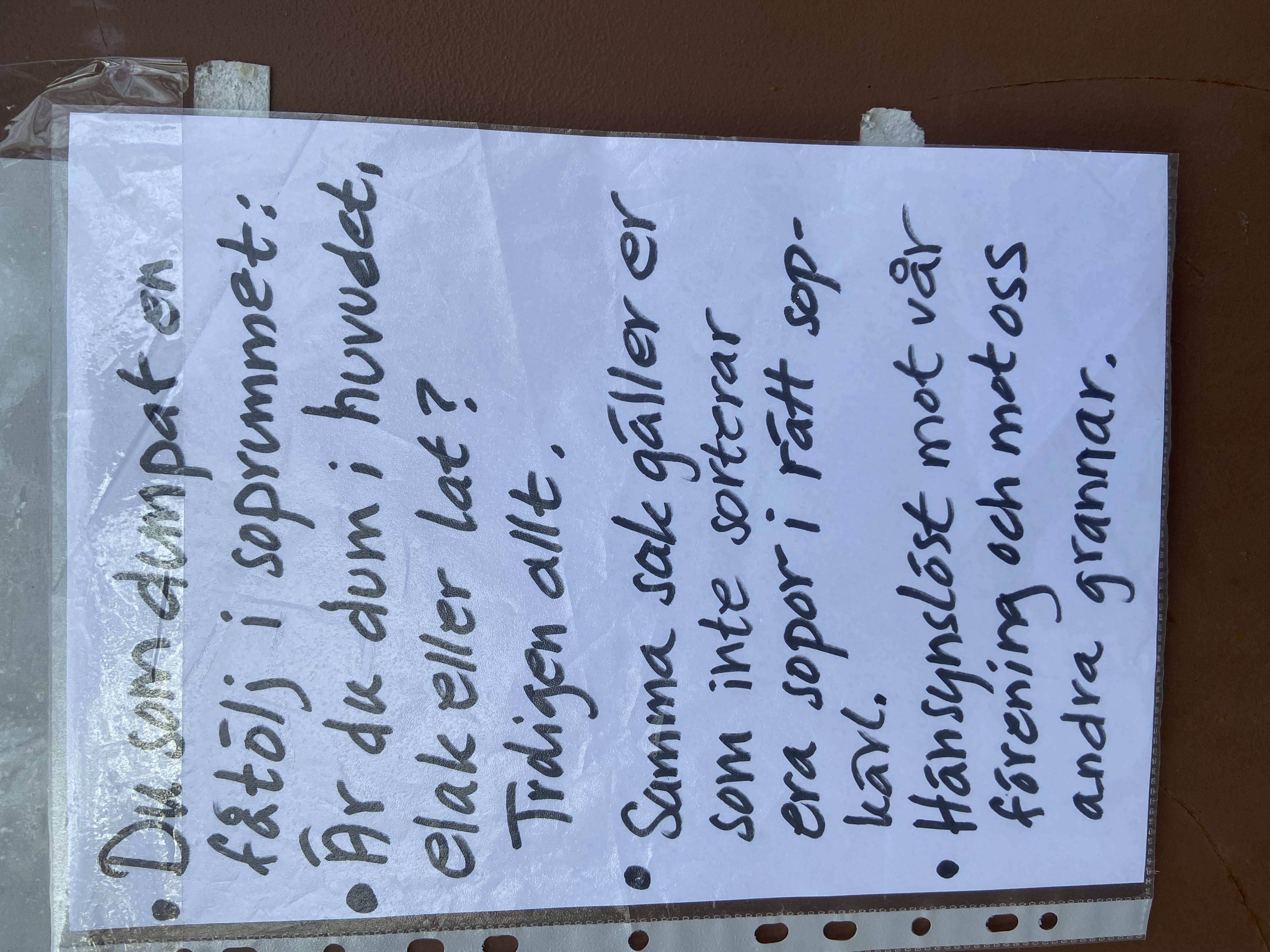 Vi i styrelsen hoppas du/ni som gör detta tar ert ansvar och tar hand om de saker ni ställer där och framförallt inte fortsätter bryta mot de regler vi har för avfallshantering